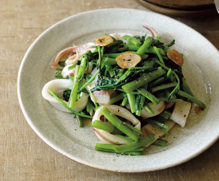 (3)同じフライパンに空心菜の茎を入れ、塩をふって炒める。色鮮やかになったら葉を加えていかを戻し入れ、オイスターソースをふり、大きく混ぜてからめる。粗びき黒こしょうをふる。