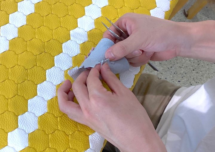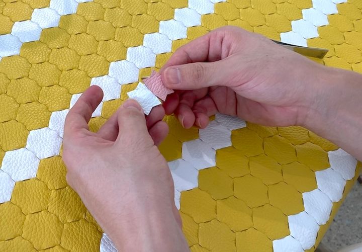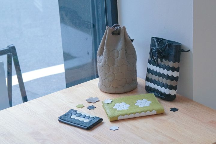 「YUKIZNA」の革製品は、製品ごとのパーツとピース状の素材を組み合わせて作られていることが特徴。ピースにはオス型とメス型があり、それぞれをパズルのように結合させることでアイテムが仕上がる構造になっています。ピースひとつひとつの色を変えることもできるのでデザインの幅が無限に近いほど広いのが魅力です。