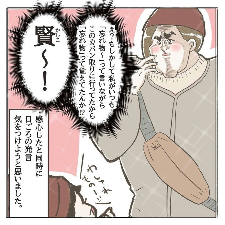 なーさんは、ジェーコさんがいつも「忘れもの」と言って、カバンを取りに行く様子をちゃんと見ていたのですね。なーさんの記憶力にジェーコさんはびっくりしたようです。