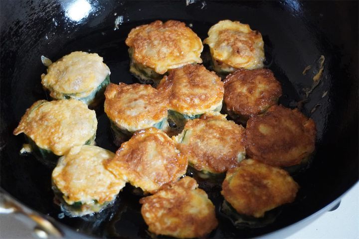 4.ズッキーニに3を詰めて両面に小麦粉をまぶし、卵液をからめる。