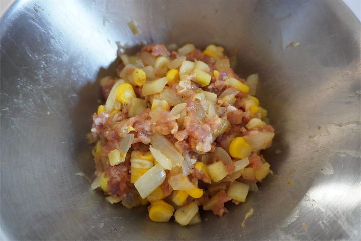 肉ダネに混ぜた玉ねぎやとうもろこしも甘く、歯ごたえもアップするので飽きのこないお味。