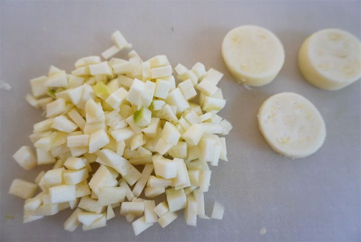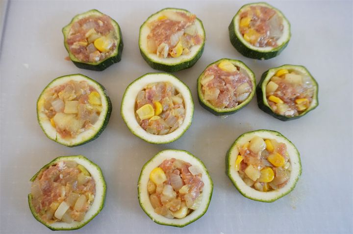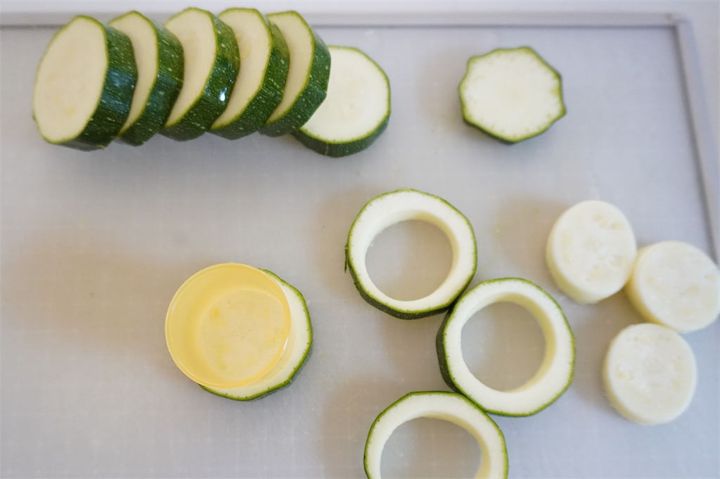 1.ズッキーニを7~8mmの輪切りにして中をくり抜き、くり抜いた中身はみじん切りにする。
