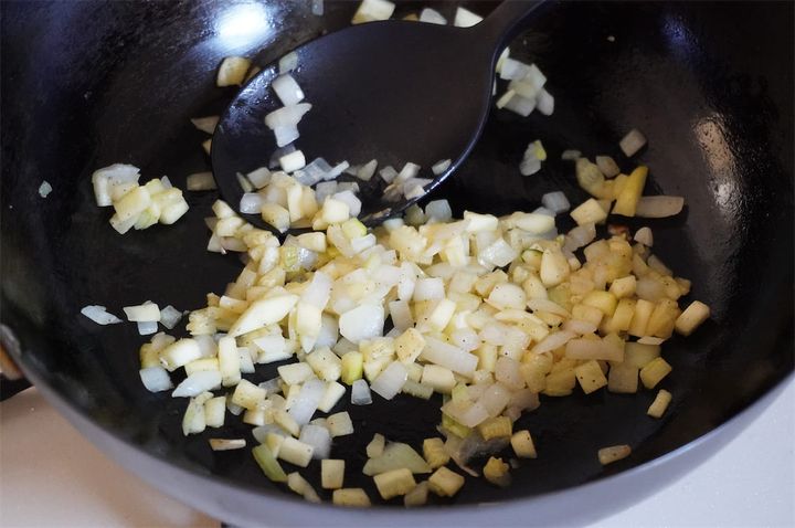 2.玉ねぎもみじん切りにして、ズッキーニのみじん切りと一緒に炒めて塩、こしょうを振る。