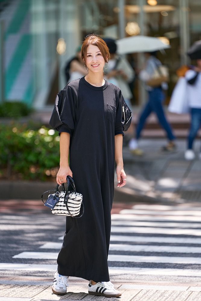 レザー素材のスニーカーは、細みで上品な雰囲気になり、大人のスニーカースタイルにピッタリ。息子の運動会の応援には、周りのママ友と合わせて、きれいめカジュアルなモノトーンスタイルにしました。サカイのワンピースは、コットンジャージーとナイロンツイルのワンピースで、1枚で甘ニッシュに。バスケットバッグとスニーカーの配色を合わせました。モノトーンのスニーカーは、どんなコーデにも馴染みやすく重宝しています♪