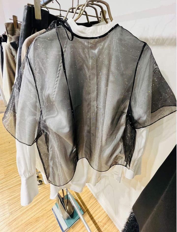 キラキラとしたスパンコールのラメ感とオーガンジー素材のコントラストは目にした瞬間思わず可愛い!と声がでてしまうような心をくすぐるキュートな一枚。首元のリボンがアクセントになっていて、Tシャツはもちろんタートルネックやキャミソールなど幅広いアイテムにマッチします。こちらを重ねるだけでレイヤードコーデがよりブラッシュアップされます。
