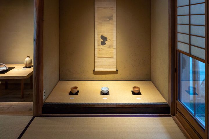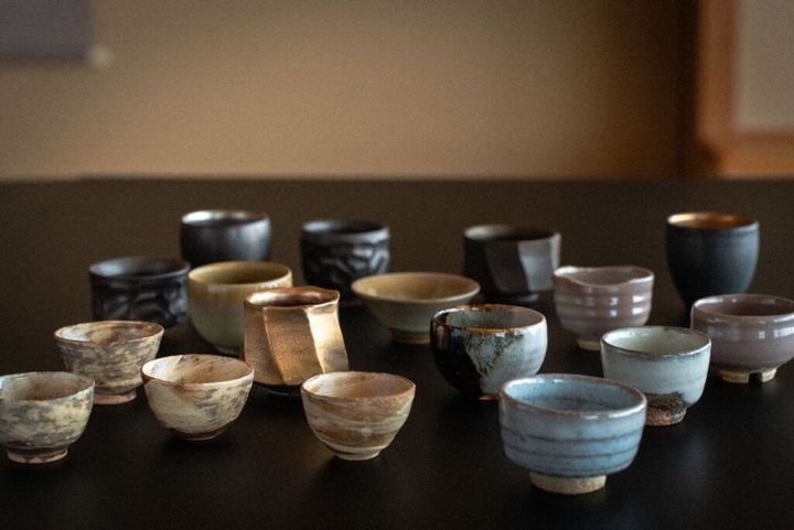 旅館『玉仙閣』では、田原崇雄のTシリーズを特別展示。新しい萩焼のスタイルを堪能できる。