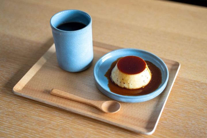旅館『玉仙閣』では、田原崇雄作Tシリーズのうつわで、特製プリンを。