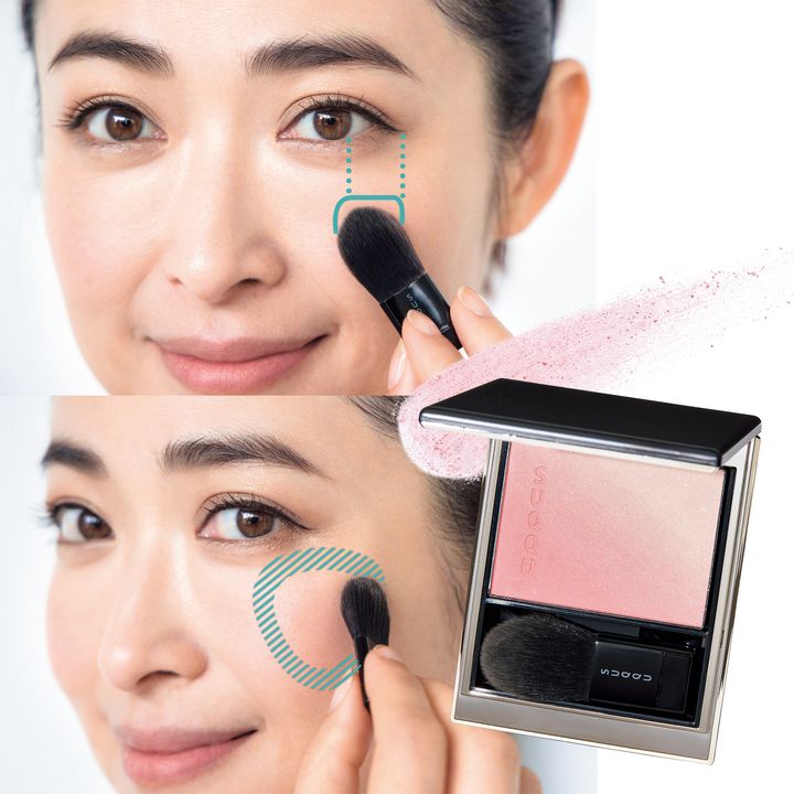 チークの左下ピンク部分をブラシに取り、頰骨ラインの黒目の下から放射状に入れて三角形にふんわりと血色感をのせる。右上のハイライト部分をブラシに取り、ピンクチークの境目をボカすように周りにのせてツヤを出す。