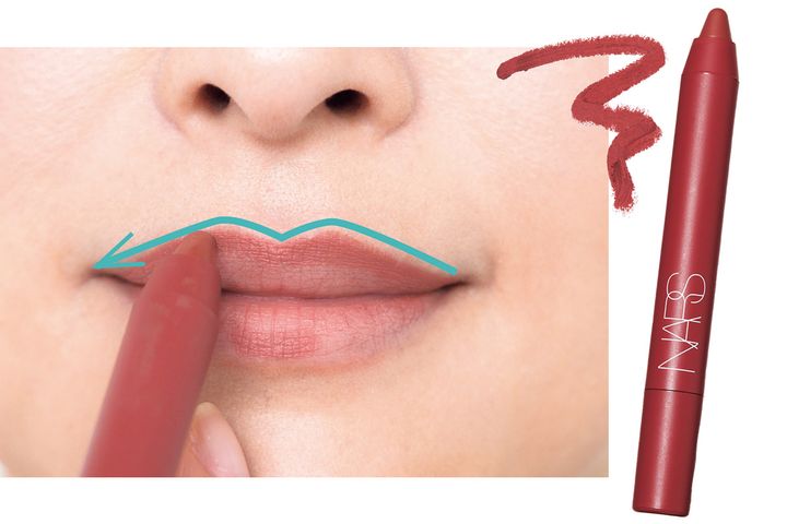 上唇のラインをオーバーめに描き、下唇は中央に一筋だけ入れてボカす。肉厚リップで知的さをアップさせ、血色もキープできる。