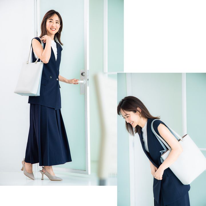 ジレ¥59,400 スカート¥52,800 カットソー¥11,000(すべてソブ/フィルム)バッグ¥29,150※7月下旬発売予定(ダイアナ/ダイアナ銀座本店)パンプス¥47,300(ファビオ ルスコーニ/ファビオ ルスコーニ ルミネ有楽町店)ピアス¥3,850〈ヘンカ〉リング[右手]¥20,900〈スキャット〉リング[左手]¥4,950〈ポピー・ケー〉(すべてロードス)