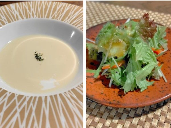 この後、ポタージュスープ、新鮮野菜のサラダが登場!