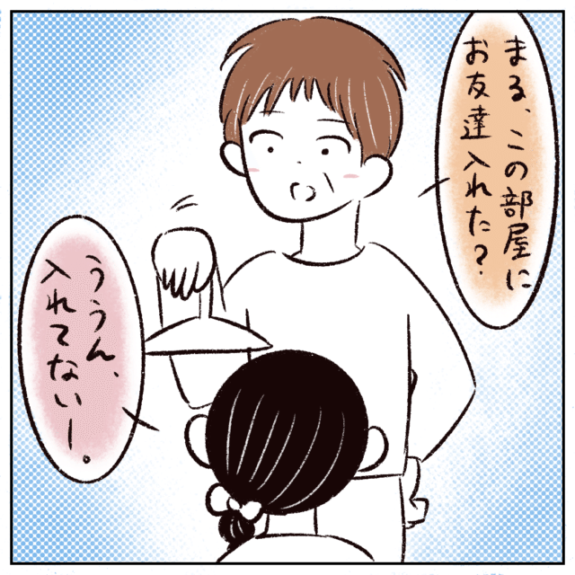 「まる、この部屋にお友達入れた?」お母さんはまるさんに確認しますが、「ううん、入れてないー」と言うまるさん。