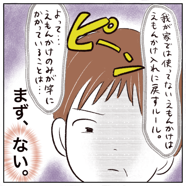 「我が家では使ってないえもんかけはえもんかけ入れに戻すルール。よって、えもんかけのみが竿にかかっていることは・・・まず、ない」ハンガーだけがかかっているのを見たお母さんはピンと来ます。