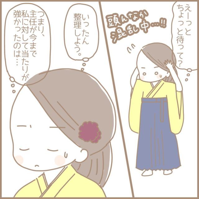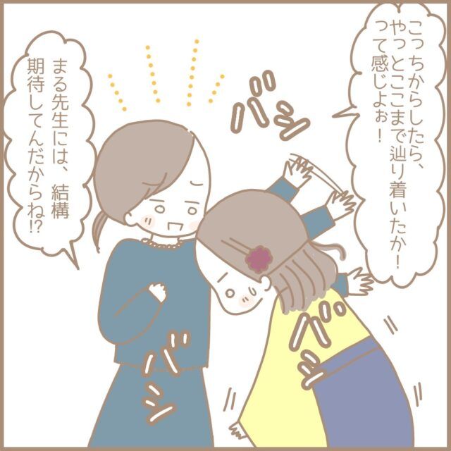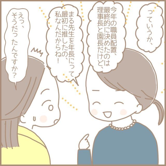 いつも厳しかった主任のちえこ先生から「いいクラスになったね」と言ってもらえたまるちゃんさん。さらに、新卒1年目のまるちゃんさんを年長の担任に推したのもちえこ先生だったと聞き驚きます。最後に「まる先生には結構期待してんだからね!?」と言って笑顔で去って行ったちえこ先生の後ろ姿を見送りながら、色々なことをいっぺんに聞きすぎて混乱していたまるちゃんさんは、頭の中を整理して「今まで主任が私に対して当たりが強かったのはなぜか」を考えました。「嫌いだった」と衝撃の告白をして、自身の苦悩や葛藤を打ち明け、最後にはまるちゃんさんのことを認めてくれたちえこ先生、情報が多すぎてすぐには飲み込めませんね。