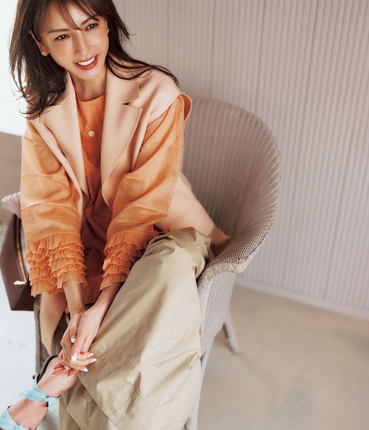 「マルゲリータ」ネックレス〈YG×DIAシトリン〉¥847,000ピアス〈YG×DIAシトリン〉¥1,001,000(すべてダミアーニ/ダミアーニ 銀座タワー)ジレ¥159,500ブラウス¥96,800パンツ¥110,000靴¥176,000〈マノロ ブラニク〉(すべてドゥロワー 二子玉川店)バッグ¥88,000(コラム/エストネーション)