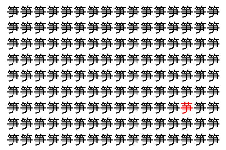 画像の中には、「笋」という漢字が縦に9行、横に16個並んでいます。 全部で144個となりますが・・・、そのうち1つは「異なる漢字」となってますよ!!