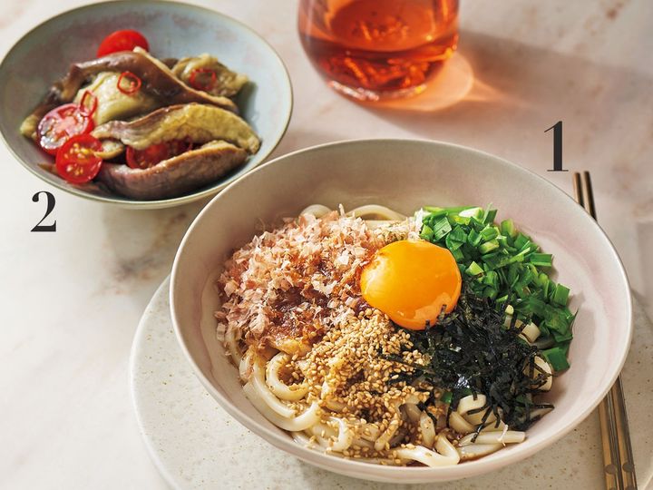 (2)器にうどんを盛り、にら、かつお節、刻みのり、すりごま、卵黄をのせる。Aを合わせてかける。