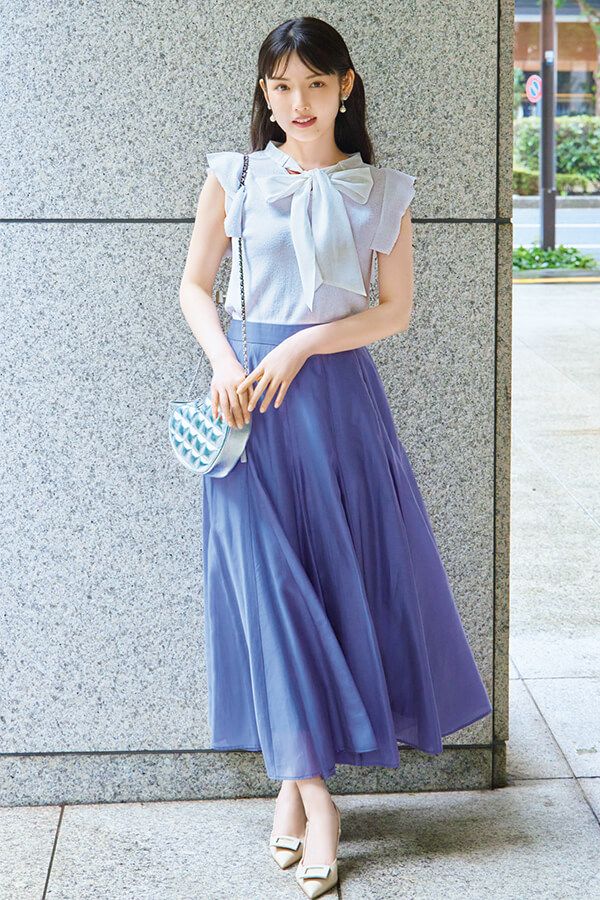 大きめリボンなど甘めディティールのアイテムを着るなら、寒色合わせでクールダウンさせるのが大人見えするコツ。ラベンダーカラーならコーデを清楚な雰囲気に導いてくれます♪