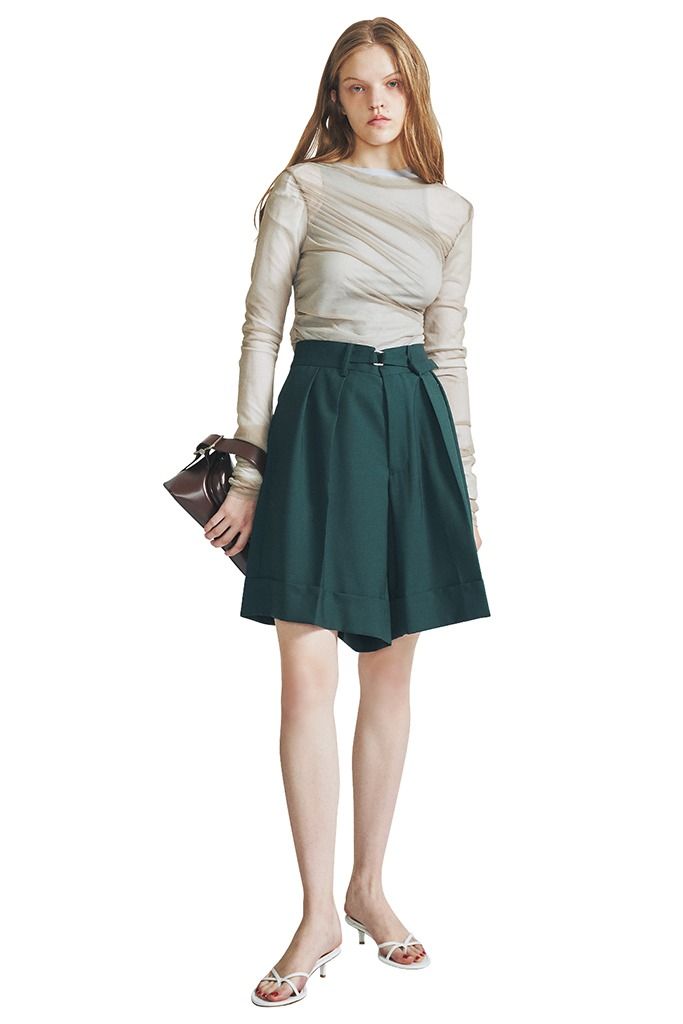 グリーンショートパンツ/beautiful people 動くたびにゆれるキュロットタイプ。脚にまとわりつかないスカートライクな見た目で、やんちゃさを感じさせない女性らしさを実現。秋からは細身のブーツにも好相性なフレアシルエット。冬はタイツを仕込んで。