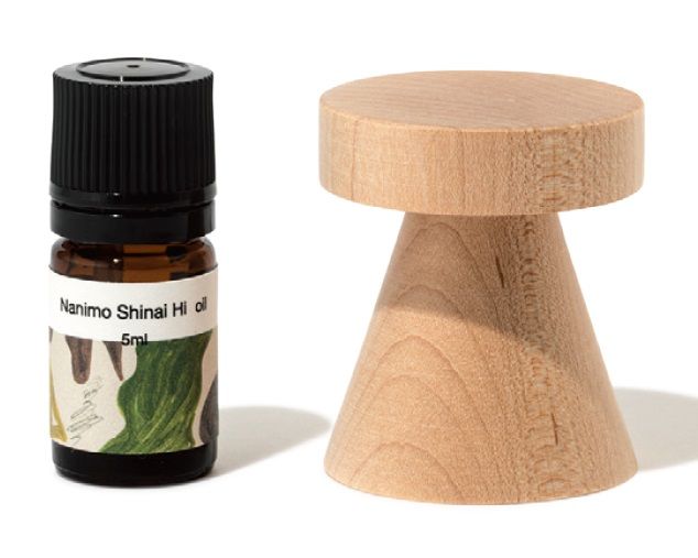 4種類の植物精油をブレンドしたアロマオイルと、ユニークな形状のウッドオブジェのセット。コンパクトだから旅のお供にも。Nanimo Shinai Hi wood objet & oil set¥5,500(グッドエイティーパーセント/アクタス TEL:03・5269・3207)