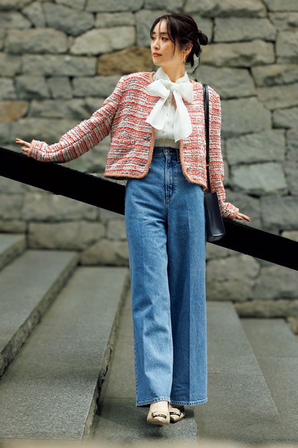 ボウタイブラウス×ツイードジャケットのおなじみレイヤードを、着映え感溢れるカラーツイードのデザインでブラッシュアップ。クラシカルなツイードはデニムでカジュアルダウンさせるとコンサバになりすぎず、取り入れやすい!