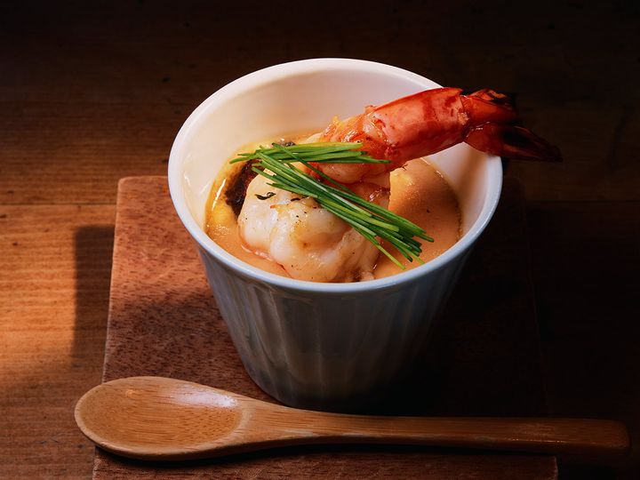 炭火で香り高く焼き上げた海老と松茸、鰹の一番だしが絶妙。なめらかな口当たりで、口の中に旨みが広がる。