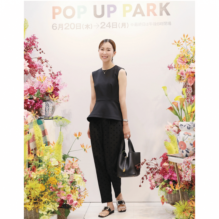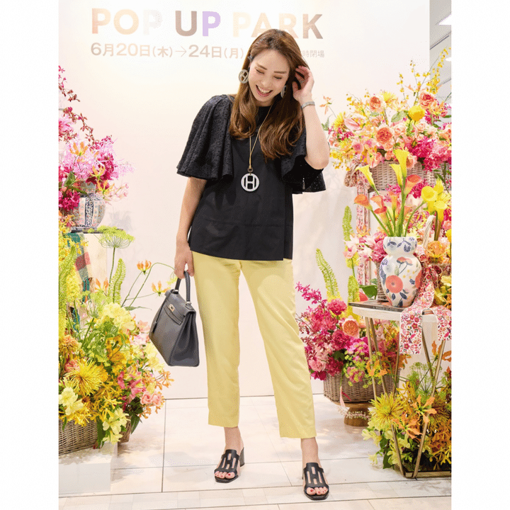 「カラーパンツを主役にしたかったので、そのほかは黒でシックにまとめました。このサンダルは安定感のあるヒールの高さで、デパートでの買い物でも歩きやすく、長時間履いても痛くならないのがお気に入り。黒なのでどんなコーディネートも締めてくれて、エキゾチックなデザインとそこからのぞく肌見せの感じも気に入っています」山田友利子さん・39歳(164cm/9歳の女の子と6歳の男の子ママ)