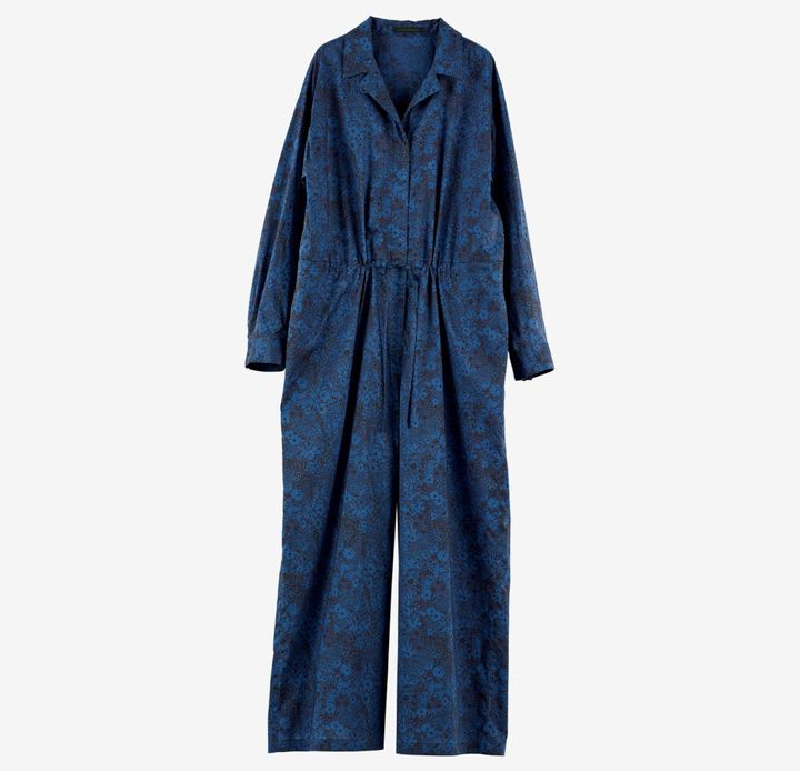 夏の庭園に咲く花々がブルーの濃淡で単色風にちりばめられたリバティプリントのオールインワンは、〈アデュートリステス〉から。まるでシルクのようなしなやかさと艶のある上質なコットン生地で、着心地も快適。身幅が広く落ち感があり、リラックスしたムードと、品の良さを兼ね備えている。フロントは比翼仕立てで、すっきりと。ジップ仕様で着やすいのも嬉しい。
