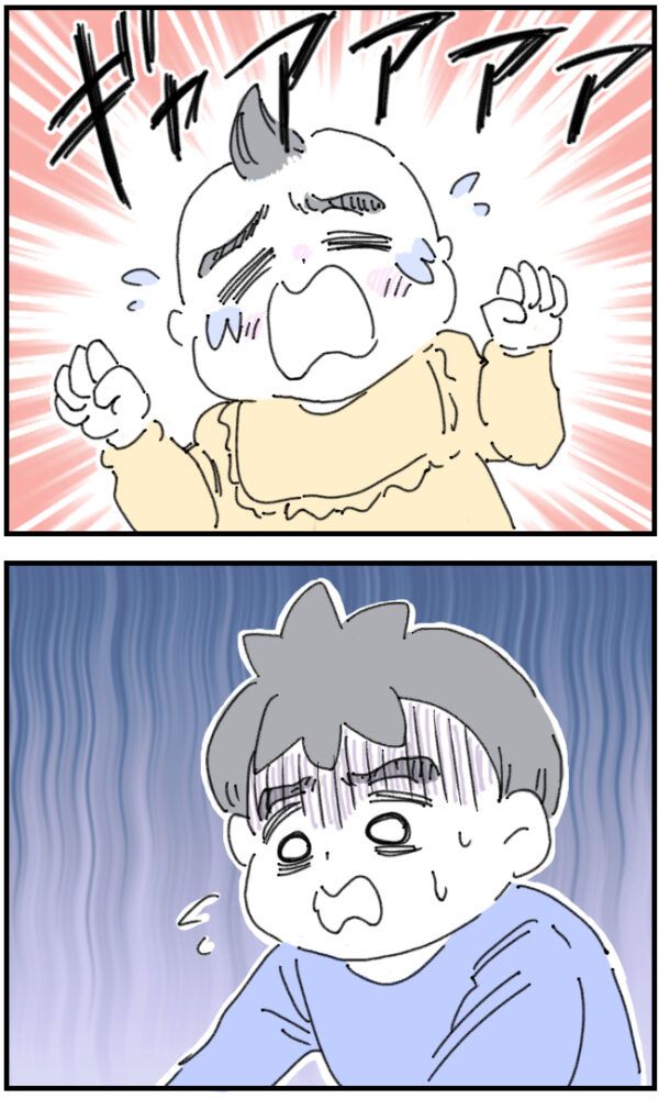 「ギャアアアア」大きな声で泣き続けるこはるちゃんを前に、なす術がなくあたふたするいちろうさん。