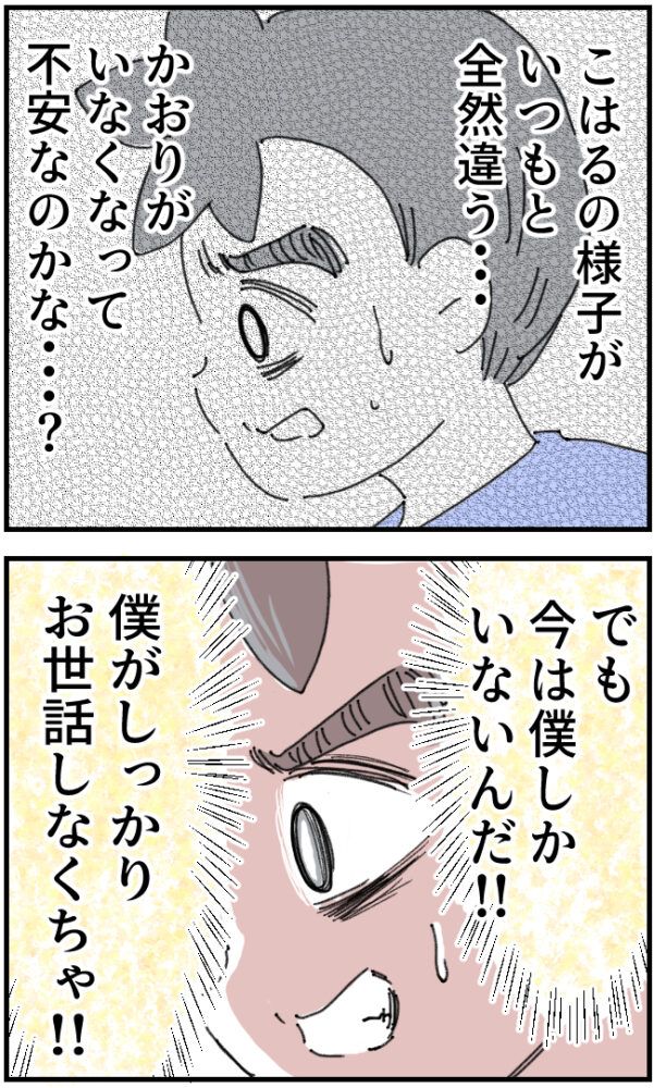 「こはるの様子がいつもと全然違う・・・かおりがいなくなって不安なのかな・・・?でも、今は僕しかいないんだ!!僕がしっかりお世話しなくちゃ!!」いつもと違うこはるちゃんの様子に動揺しながらも、自分しかいないという使命感でこはるちゃんと向き合ういちろうさん。
