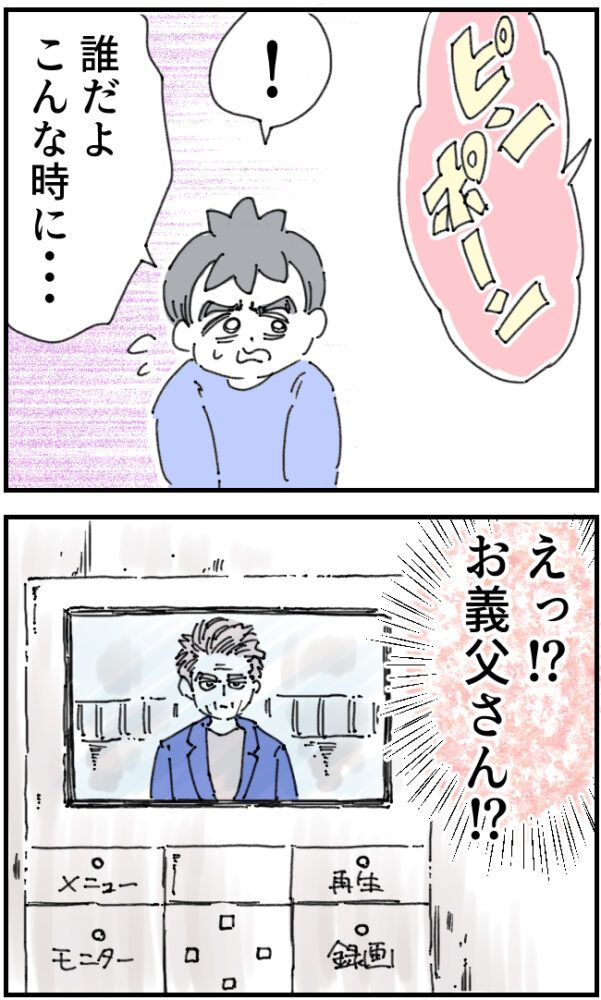 その時、「ピンポーン」とインターホンが鳴りました。「!誰だよこんな時に・・・」こはるちゃんの対応で手一杯で余裕のないいちろうさんがモニターを確認すると、そこには予想外の人物が映っていました。「えっ!?お義父さん!?」突然の義父の訪問にいちろうさんはとても驚きました。