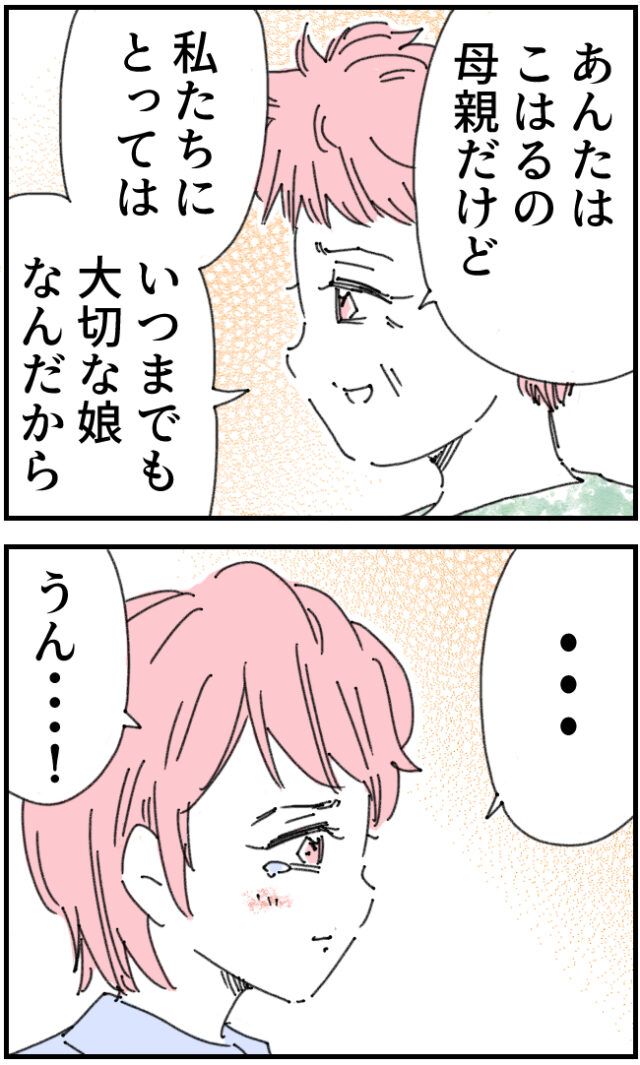 「あんたはこはるの母親だけど、私たちにとってはいつまでも大切な娘なんだから」温かく包み込むような眼差しでかおりさんを見つめながらそう言ったお母さんの言葉に、かおりさんは「うん・・・!」と涙ぐみます。