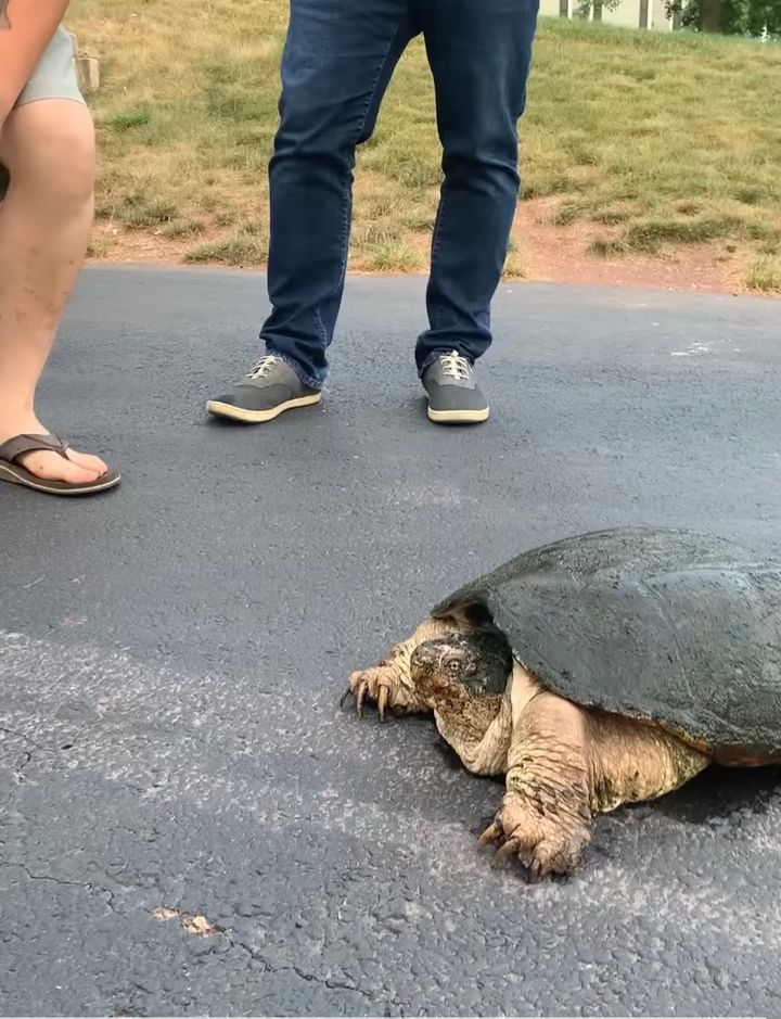 撮影者さんたちの目の前にいるのは巨大なカメ。 それも咬合力の強さと凶暴な性格で知られる「カミツキガメ」です。