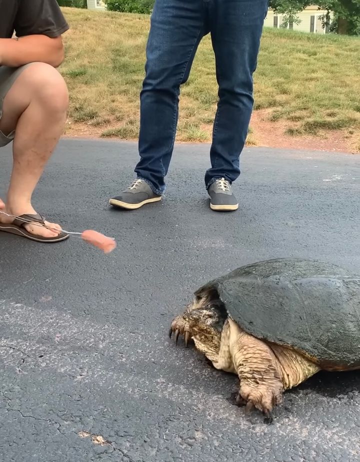 合法的な手段で捕獲されたというこのカミツキガメが飢えないように、男性がエサのソーセージを差し出します。 すると直後に、衝撃的な光景が目撃されるのです。