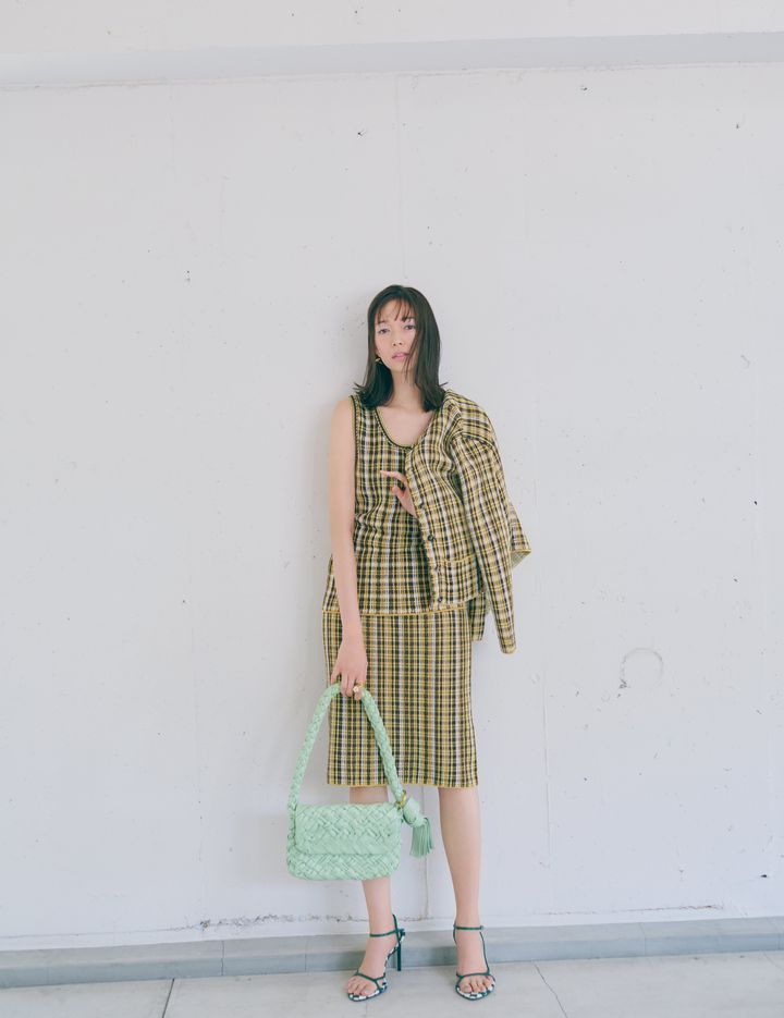 大人っぽい印象を演出できるセットアップは、無難な無地を選ばず、ここはあえてのチェック柄で遊びを効かせてオシャレ上級者に。コンサバになりすぎないよう、発色のいいグリーンのバッグをアクセントにすれば、華やかさも出せる。足元は軽やかなセットアップに合わせたチェック柄サンダルで抜け感を。お花をモチーフにした指輪でさりげなく可愛さをプラスして、無敵のセットアップスタイルに!