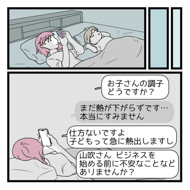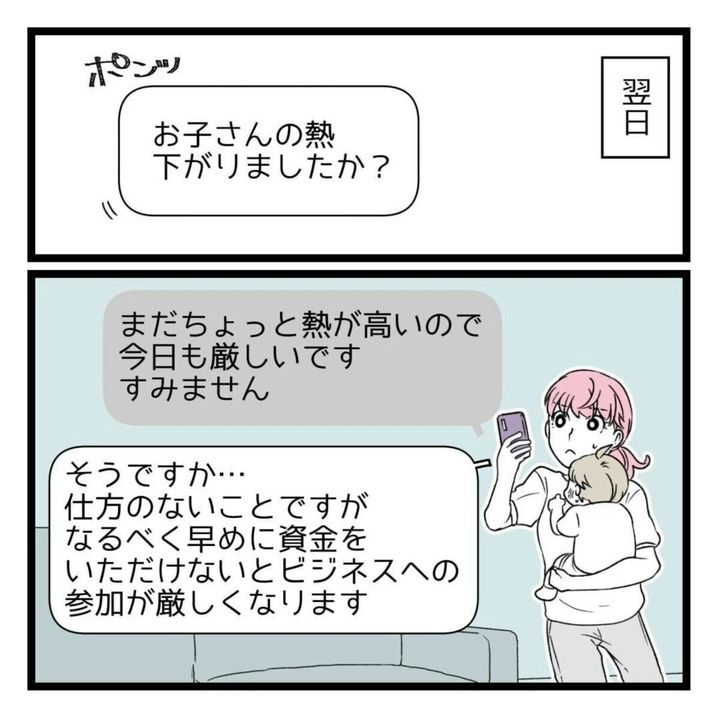 しかし「絶対に稼げる」と言われ、3階の面談を受けると即日合格。ビジネス資金を準備しますが、支払い当日に子どもが熱を出してしまうのです。