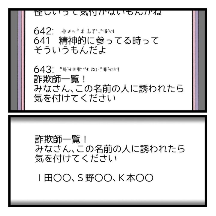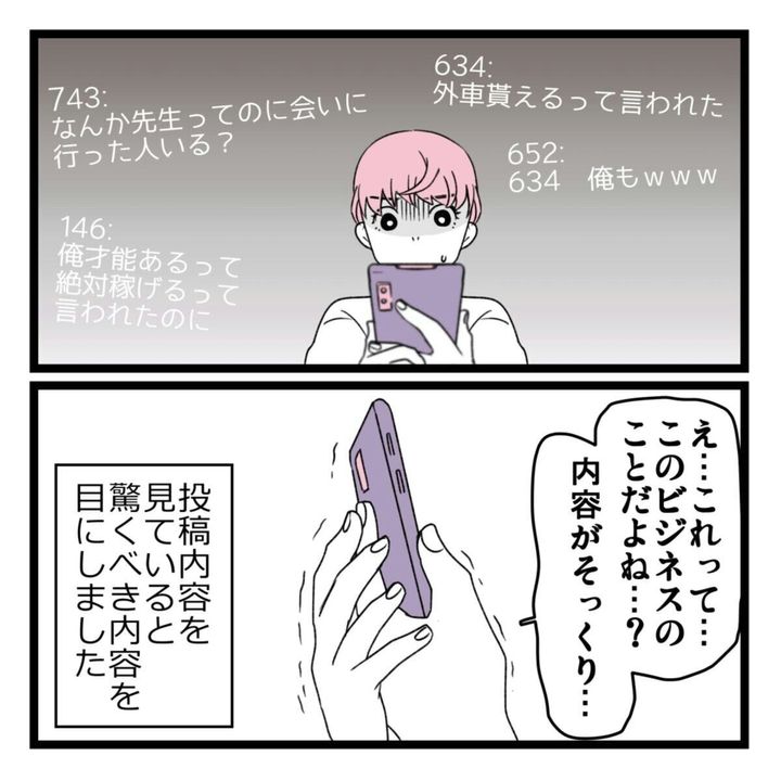 考えるほど強い違和感を抱き始めた山吹さんがネットで検索すると…「詐欺ビジネス被害者掲示板」にたどりつきます。しかもそこには、面談で出会った3人の名前が記載されていたのです。