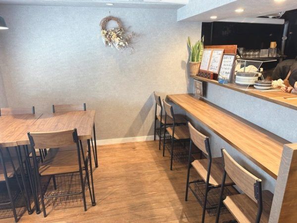 店内は外観のグレーよりも明るいグレーとウッド調のテーブルと椅子がかわいらしい雰囲気です。4名席と2名席のテーブルと、カウンター席があり、10席のこじんまりとした落ち着く空間です。