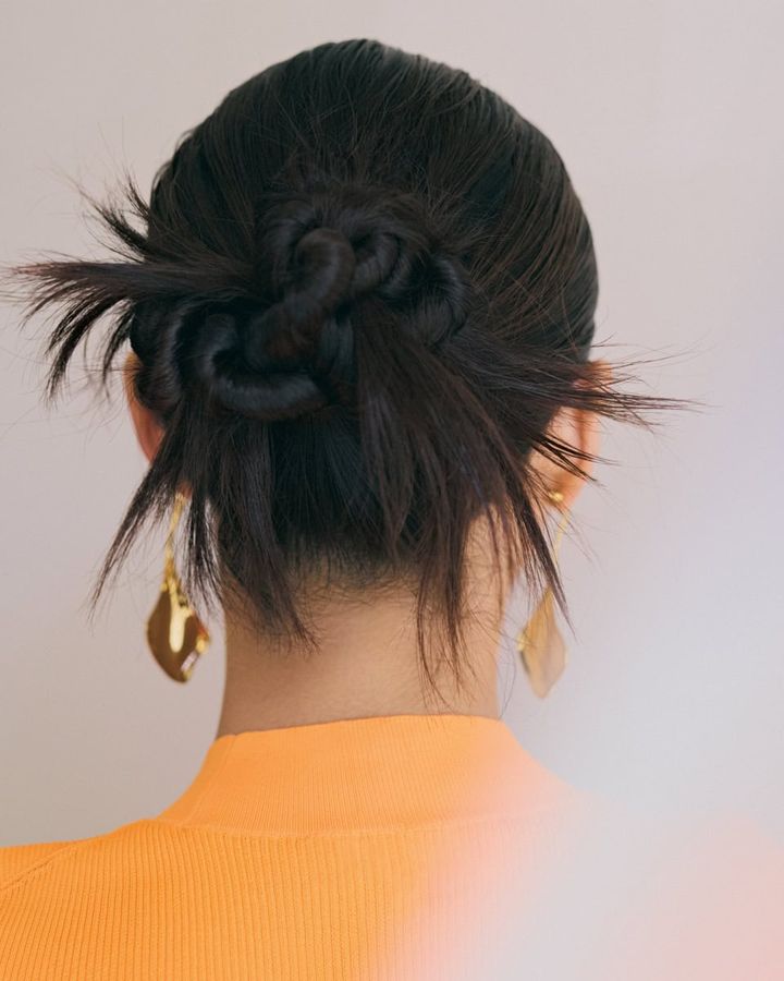 2. 小さなシニヨンを作るイメージでまとめたら、毛先を散らすように残しつつ、根元をピンで留めていく。残りの2束も同様に仕上げて完成。形はあまり気にせず、適当でOK。