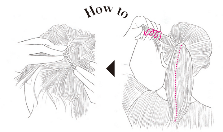1. ワックスを髪全体に軽くなじませたら、好きな位置でキュッとタイトにひとつ結びをする。結んだ毛を3つほどの毛束に分けたら、ひと束を指に巻きつけながらきつくねじっていく。