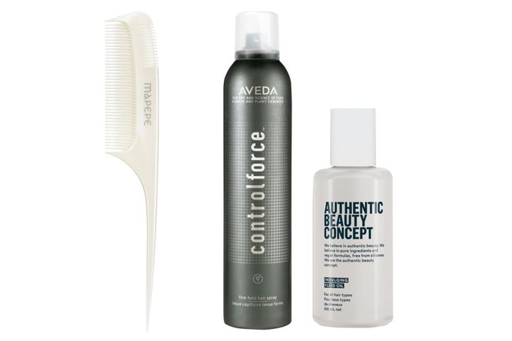 右から:髪にまとまりとツヤを与える。オーセンティック ビューティ コンセプト インダルジング フルイド オイル 100mL ¥5,060(ヘンケル コンシューマーブランド)、キープ力が高いスプレー。コントロール フォース 235mL¥4,180(アヴェダ)、分け目を取ったり、タイトに仕上げたり……と万能なコーム。目の粗さの塩梅が絶妙。マぺぺ バングスセットコーム ¥660(シャンティ)