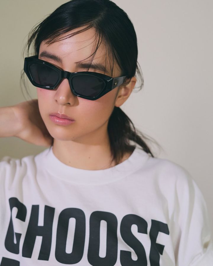 Tシャツ¥15,400(サードマガジン×ミコモリ×キャサリン・ハムネット/サードマガジン)、サングラス¥13,200(ペタ アンド ジェイン/ジャック・オブ・オール・トレーズ プレスルーム)