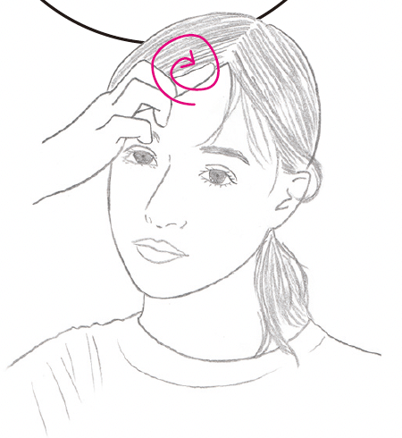 シンプル&タイトにまとめたら、分け目を指でクルクルするか、コームでとかすようにして顔まわりの産毛を引き出す。オイルをつけて毛流れやニュアンスを出した後は、スプレーでキープを。