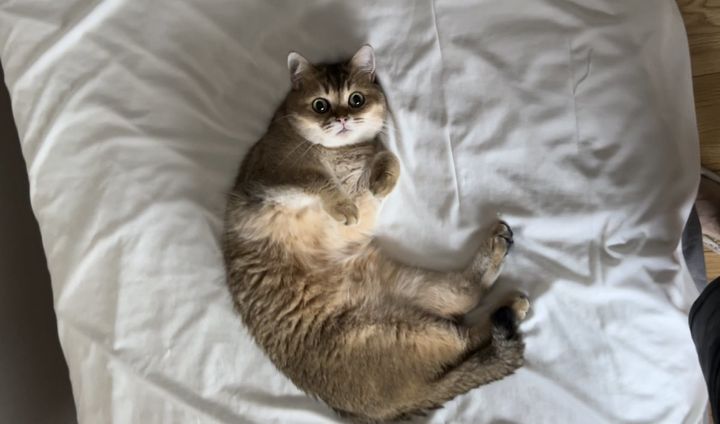 ベッドに横たわり驚いたように目をまん丸くしているこたつくん。自分のベッドじゃないとわかりショックを受けているようにも見えますし、飼い主であるぽてこゆこめ。さんに「そうなの?」と問いかけているようにも見える表情ですよね。猫ってこんなにも表情が豊かになるものなのかと驚きですし、何とも言えないポーズと表情がいい味を出していてかわいいですよね。