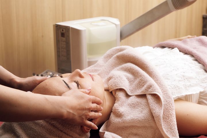 理容師国家資格を持つ施術者が、スチームを当てながらクレンジング。ニュージーランドの自然派コスメ、キャロルプリーストを使用している。