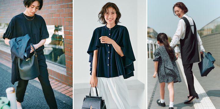 清潔感抜群のネイビー×白コーデ。動くたびに揺れるドレープの効いたケープ袖が、秋の気配を感じさせる洗練オシャレを演出。気になる二の腕もカバーしてくれて、キレイめパンツとも好相性です。