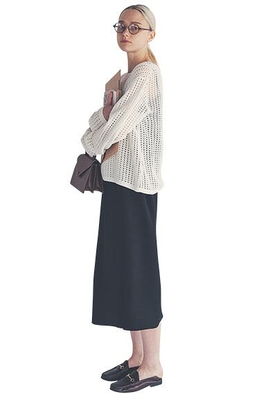 キャミの上にゆるニットをかぶせて肌感をセーブ