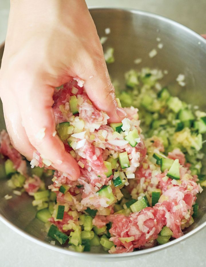 豚肉は細かく切り、包丁で粗めにたたく。きゅうりは5mm角に切る。セロリは粗いみじん切りにする。ボールに肉だねの材料をすべて入れ、手でよく混ぜる。