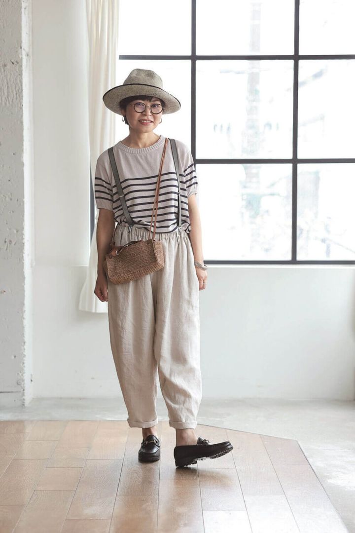 和紙素材のサマーニット×リネン素材のパンツで爽やかに。「トップスもボトムスも暑い夏のヘビロテアイテムです。帽子とサスペンダーの小物を加えて、あえて少年ぽさを出してみました」