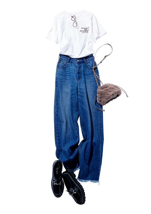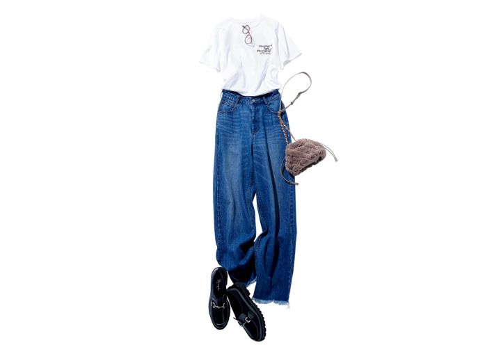 バックプリントTシャツ¥17,050/ザ インターナショナル アート コレクション(シセリー) デニムパンツ¥20,900/リエル リシェ ローファー¥33,000/銀座かねまつ(銀座かねまつ6丁目本店) ファーバッグ¥13,200/ノエラ メガネ¥1,990/UNIQLO